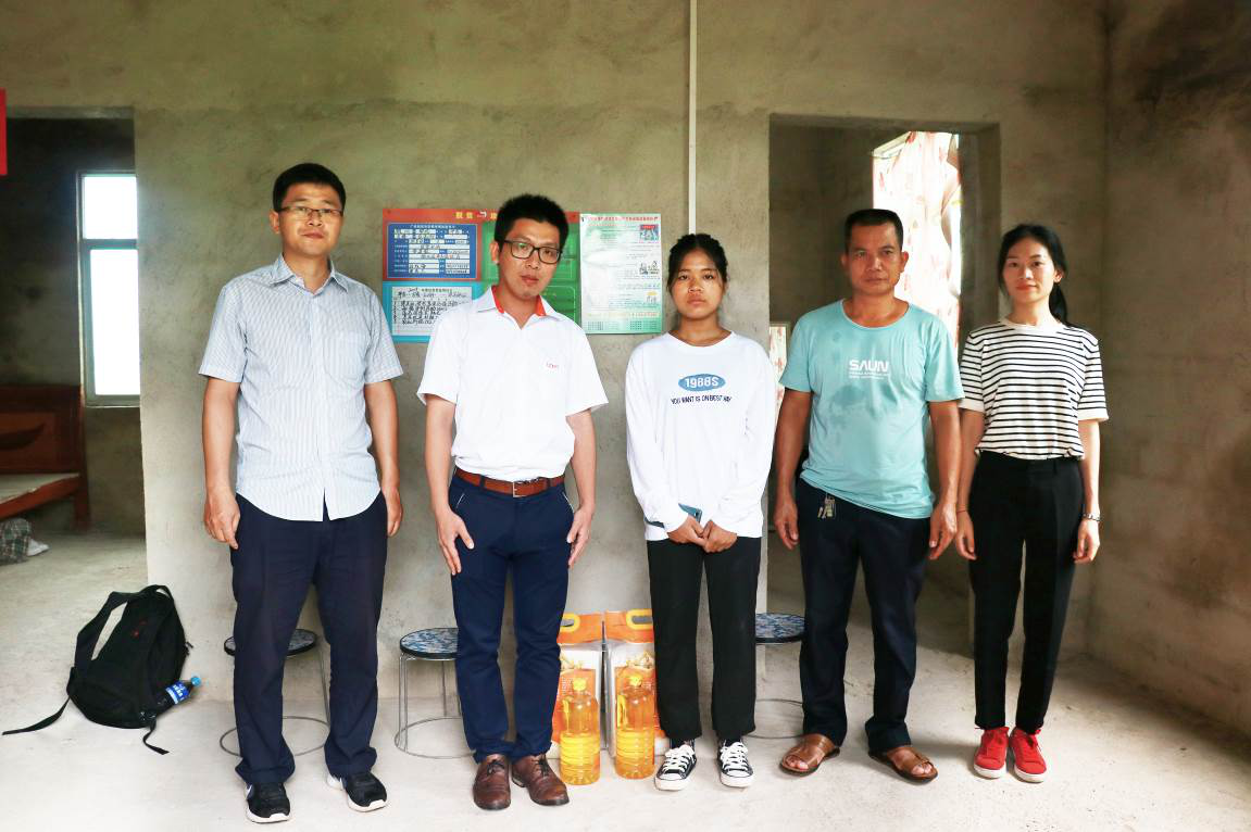欽州當地扶貧部門干部、播恩代表人員與梁美麗同學(圖左三)合影