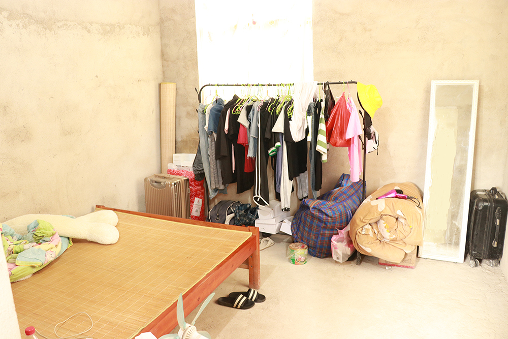 小小的房子里,剛進到前廳,抬頭就能看到墻上掛著的貧困證明等文件。周圍沒有擺設任何的家具,凳子還是梁同學急急忙忙從房間里搬出來的。后面則是姐弟兩人的房間。梁美麗房間的東西略微比弟弟多一些。但說是多一些,其實也只有一張床,一面鏡子,兩個旅行箱,和一些掛在架子上的衣服而已。