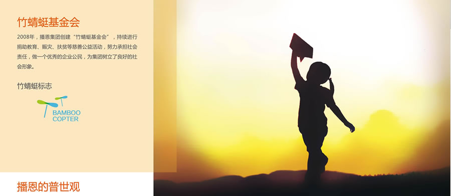 播恩于2008年創建“竹蜻蜓慈善”。持續進行捐助教育、賑災、扶貧等慈善公益活動,努力承擔社會責任,做一個優秀的企業公民,為播恩樹立了良好的社會形象。
