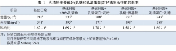在谷物和植物蛋白型日糧中添加干乳清和脫脂奶粉等乳制品可以提高仔豬的生長性能(表1)。在常規(guī)日糧(玉米、豆粕、去殼燕麥)中添加10%~20%的干乳清可使3周齡斷奶仔豬的生長性能提高15%。