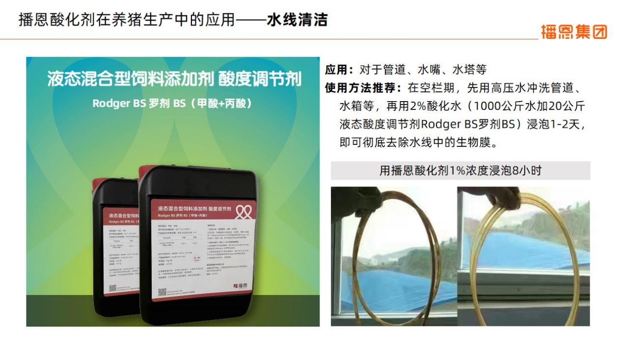 他指出,酸化劑可以降低生豬胃腸道pH值,減少大腸桿菌、沙門氏菌等致病菌的數(shù)量。播恩集團(tuán)液體酸化劑具有豐富的技術(shù)歷史沿革,特點(diǎn)是高效、安全、穩(wěn)定、促健康等。酸化劑主要運(yùn)用在豬場消毒、清潔、動物飲水添加等多方面,可有效抑菌、抗病毒,提升豬場生產(chǎn)性能。