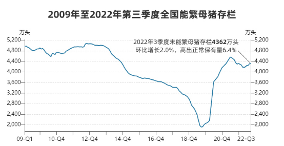 2022年3季度末能繁母豬存欄量環(huán)比增長(zhǎng),高出正常保有量6.4%