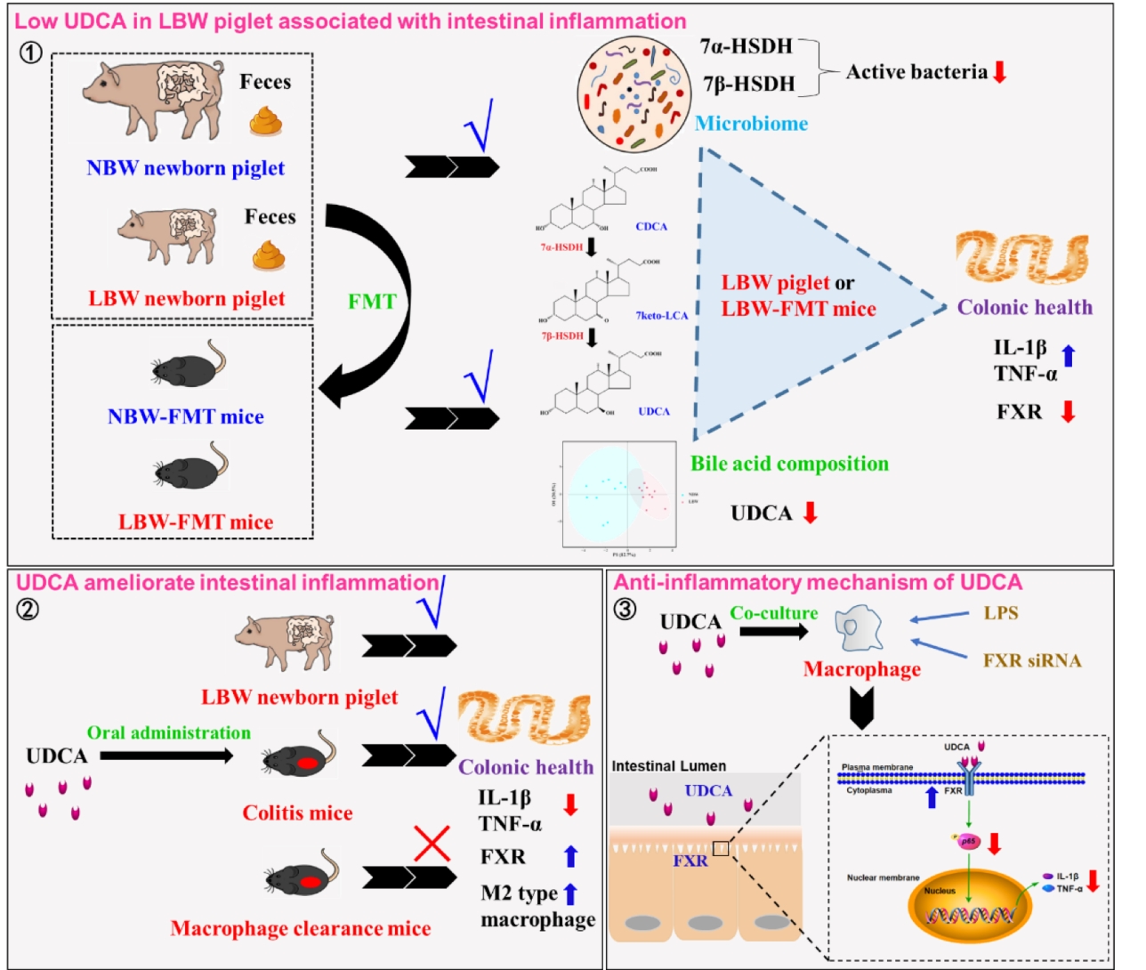 在養豬生產中,宮內生長受限(Intrauterine growth restriction, IUGR)豬的發生率高達20%,其導致仔豬出生重低以及繼發的哺乳期高死亡率和全期低生長性能,是養豬業目前存在的突出問題之一。前期的研究結果顯示,IUGR導致的仔豬低出生體重(LBW)與出生后腸道炎癥狀態密切相關。然而,關于LBW導致腸道炎癥發生發展的分子機制尚不清楚。為此,《腸道微生物代謝產物熊脫氧膽酸通過促進腸道M2型巨噬細胞極化緩解低出生重仔豬結腸炎癥》課題研究綜合運用靶標膽汁酸代謝組和微生物組學技術、糞菌移植和巨噬細胞清除等研究手段,探究了膽汁酸(BAs)在LBW新生仔豬誘導腸道炎癥中的介導作用及其分子機制。
