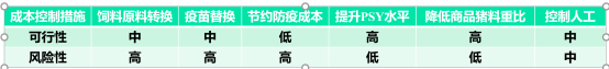 從降本措施來說,各項活動的可行性和風險性都是并存的,如在進行飼料原料的更換時,可能會降低成本,但是也可能會引起豬的應激反應。
