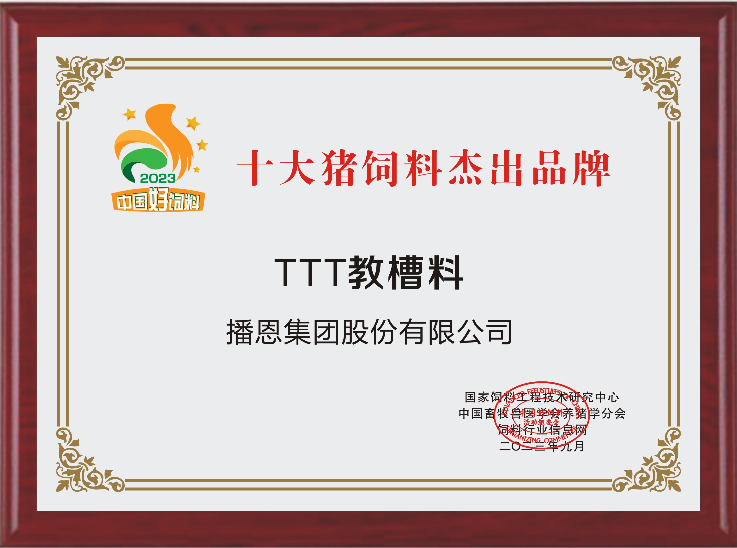 “TTT教槽料——十大豬飼料杰出品牌”獎牌