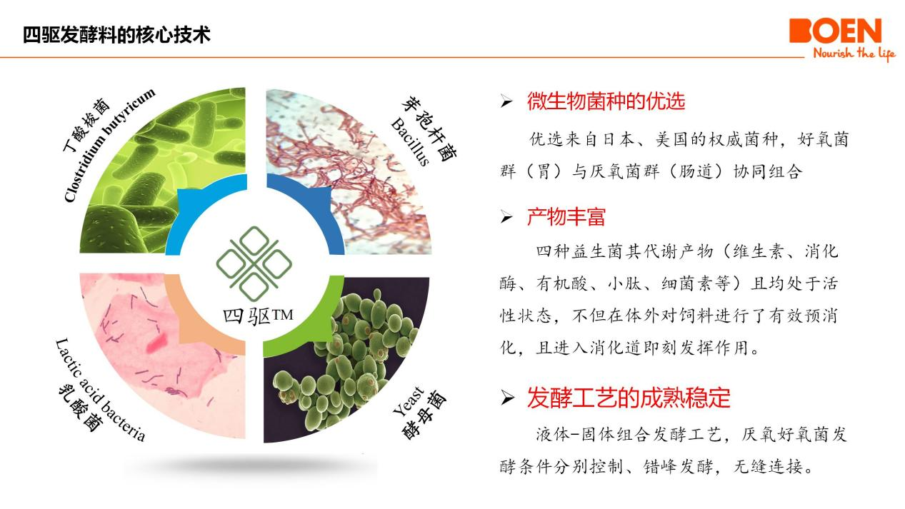播恩四驅雙酸發酵料是一款運用先進生物工程技術研發的新時代產品。它精選芽孢桿菌、酵母菌、乳酸桿菌和丁酸梭菌四株優質菌種,采用厭氧和好氧相結合的發酵工藝,經14天以上深度發酵,產生大量有益菌及其代謝產物。這種獨特的菌種組合和發酵工藝,賦予了四驅雙酸發酵料多重優勢: